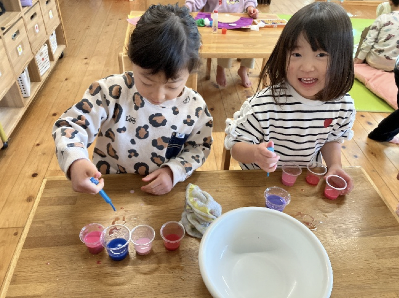 スポイト遊びを楽しんでいます。最初は使い方を覚えながら、水玉を沢山作ったり、割り箸で水玉を移動させて色の変化を楽しみました。