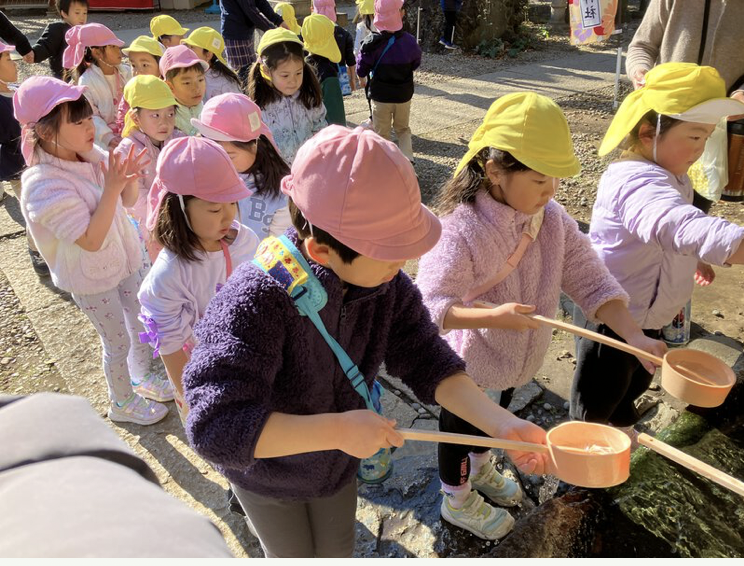 春になったら新1年生のどんぐり組さん。まず手を洗って身を清めてから、お参りをしました。