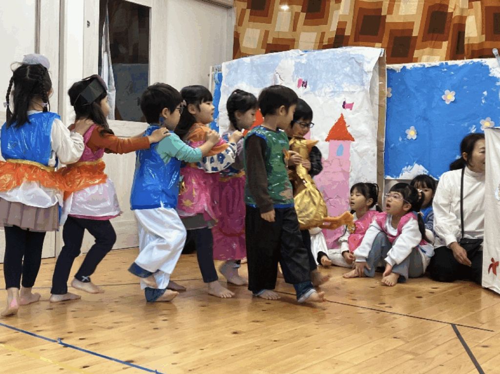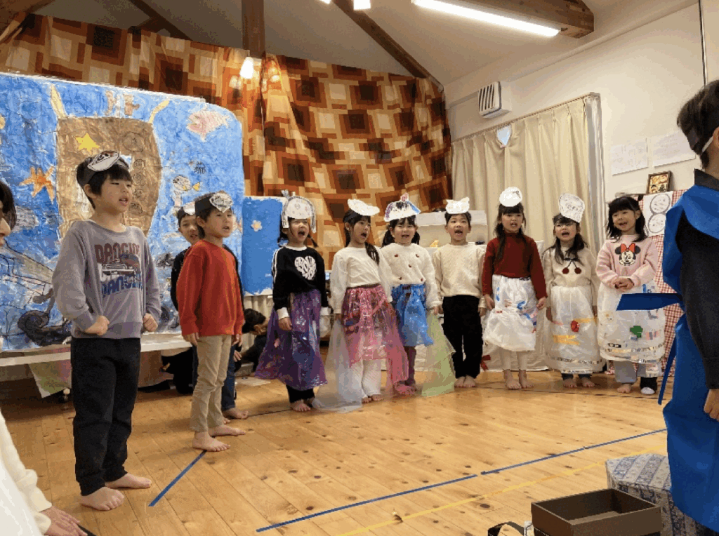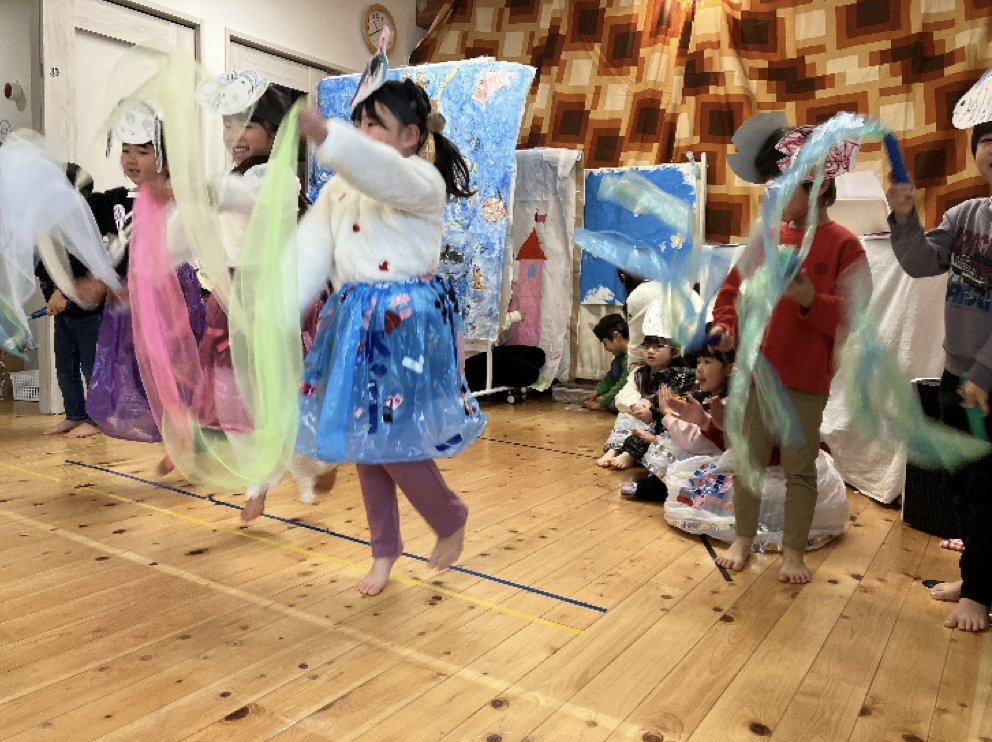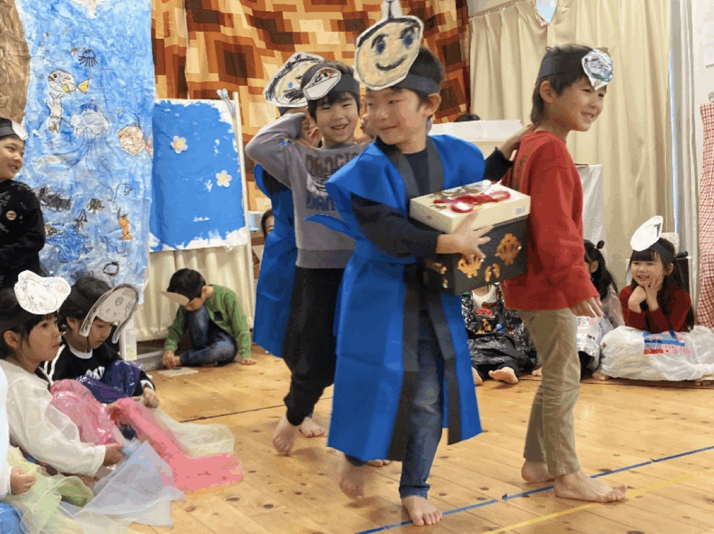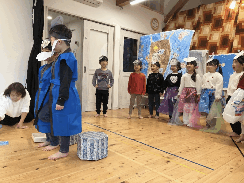 セリフはもちろん、衣装、背景、大道具、小道具も子ども達で考えて