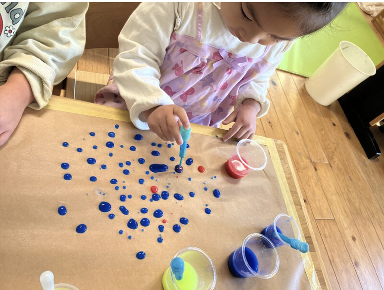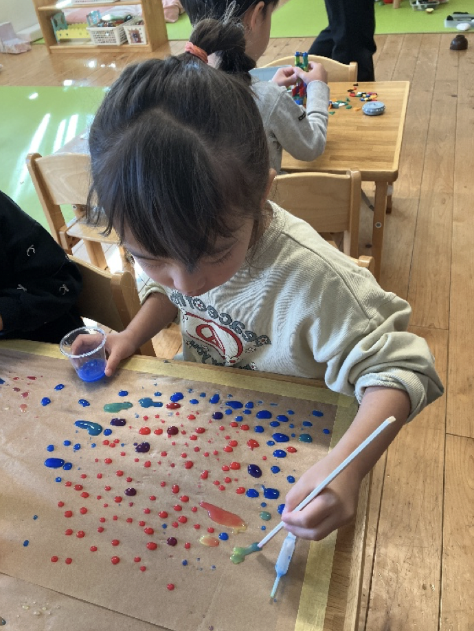 スポイト遊びを楽しんでいます。最初は使い方を覚えながら、水玉を沢山作ったり、割り箸で水玉を移動させて色の変化を楽しみました。